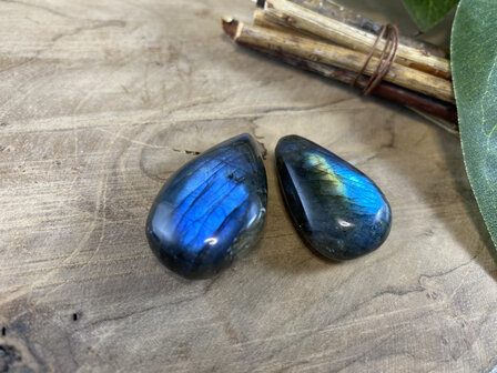 Doorboorde Labradoriet hanger in druppel vorm uit Madagascar. Circa 30 x 20 x 13 mm en 12 gram. Prijs is per stuk.